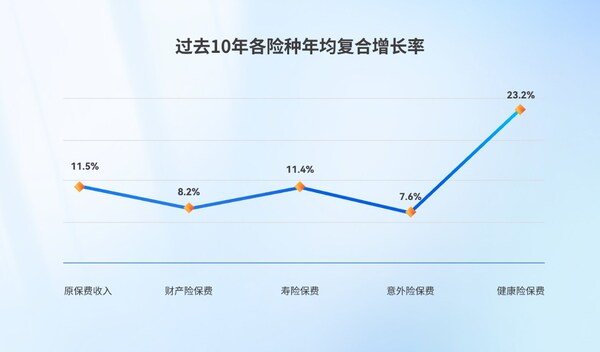 2023年,行業(yè)健康險業(yè)務(wù)突破9000億,保費增速也在經(jīng)歷連續(xù)五年下降后,首次實現(xiàn)企穩(wěn)回升。過去10年,我國健康險保費增長了七倍,年均復合增長率達到了23.2%,是過去10年增長最快的險種。