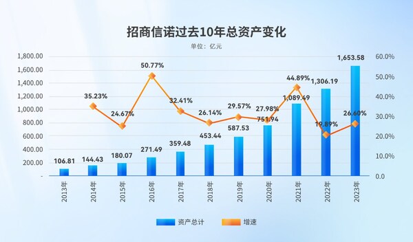 過去10年,招商信諾總資產(chǎn)增長了14.5倍,年均復合增長率達到了31.5%,遠超行業(yè)平均增速。