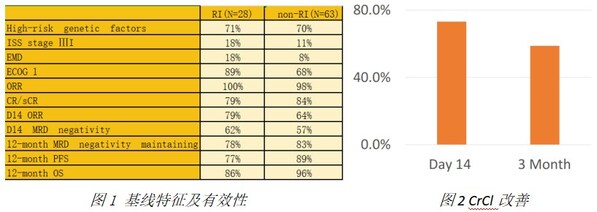 此次壁報內(nèi)容基于FUMANBA-1研究(研究登記號:NCT05066646)。此項研究中共納入91例既往無CAR-T治療史的患者接受伊基奧侖賽注射液的治療,中位隨訪時間為18.07個月。根據(jù)CAR-T治療時肌酐清除率(CrCl)是否≤70ml/min,將患者分為腎損組和非腎損組。其中28例患者屬于腎損組伴有腎功能損傷,CrCl在40至70 ml/min之間,63例屬于非腎損組,CrCl>70 ml/min。