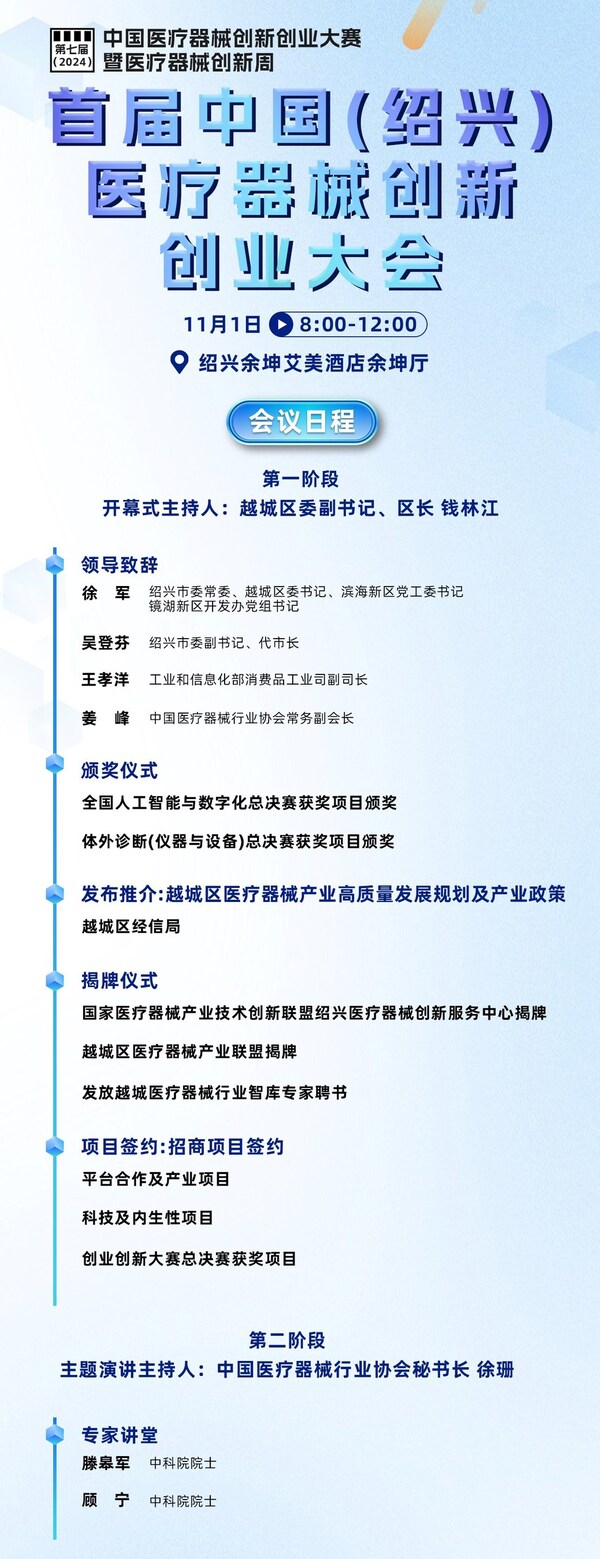 紹興2024年10月25日 /美通社/ -- 傳統(tǒng)招商政策轉(zhuǎn)型、醫(yī)械增長趨勢放緩,醫(yī)械企業(yè)聚集交流共謀創(chuàng)新發(fā)展之勢迫在眉睫。第七屆(2024)中國醫(yī)療器械創(chuàng)新創(chuàng)業(yè)大賽總決賽暨醫(yī)療器械創(chuàng)新周系列活動,一賽一展及多個專業(yè)論壇,將于10月30-11月3日與您相約紹興。