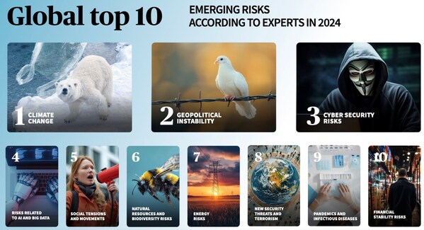 上海2024年11月13日 /美通社/ -- 近日,安盛集團發(fā)布了《2024未來風險報告》(以下簡稱《報告》),通過匯聚全球3000名專家的真知灼見,調研訪談歐洲、美洲和亞太地區(qū)超過50個國家和地區(qū)的20000多名代表性樣本,總結出當前全球面臨的十大風險,為預測和應對未來風險提供了權威借鑒。