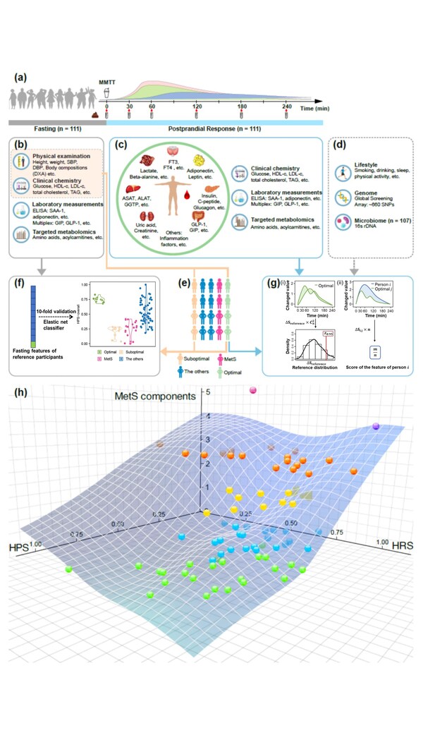 基于此,研究團(tuán)隊招募了111名年齡跨度從20歲至70歲的健康、肥胖和代謝高危個體。通過收集并檢測了參與者在空腹?fàn)顟B(tài)下以及攝入含有糖、脂、蛋白質(zhì)的食物后5個時間點的上百種代謝組學(xué)和肝臟、腸道、胰腺等主要器官功能相關(guān)指標(biāo)的動態(tài)變化。通過分別整合空腹和進(jìn)食后的動態(tài)數(shù)據(jù),研究團(tuán)隊構(gòu)建了一個全新的代謝健康量化模型——"健康狀況圖譜"(Health State Map, HSM),這一模型能夠全面反映個體空腹時的健康狀況和餐后的代謝穩(wěn)態(tài)恢復(fù)能力。