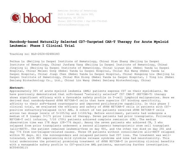 北京2025年1月14日 /美通社/ -- 近日,陸道培醫(yī)院陸佩華院長作為第一作者和通訊作者,在國際血液學權(quán)威期刊Blood(IF=21)在線發(fā)表了題為"Nanobody-based Naturally Selected CD7-Targeted Chimeric Antigen Receptor T Cell Therapy for Acute Myeloid Leukemia"的研究論文。這項研究成果標志著在急性髓系白血?。ˋML)治療領(lǐng)域的又一重大突破。