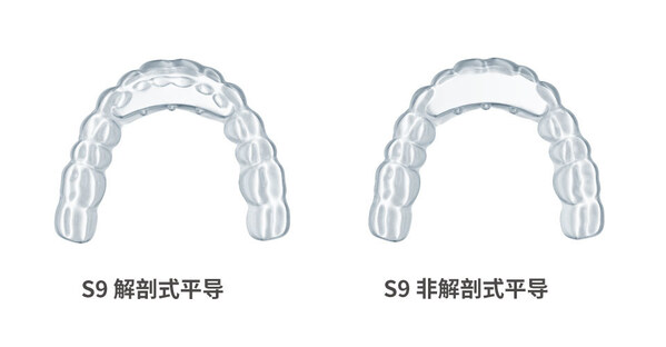正雅S9平面導(dǎo)板技術(shù)是上頜平面導(dǎo)板的隱形化,根據(jù)平導(dǎo)表面結(jié)構(gòu),S9 分為解剖式與非解剖式兩種。解剖式平導(dǎo)在表面壓制咬合印痕,可適度前導(dǎo)下頜;非解剖式平導(dǎo)表面沒咬合印痕,下頜可自由滑動(dòng)。
