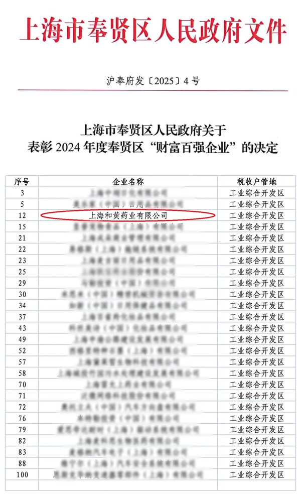 上海2025年3月24日 /美通社/ -- 日前,滬奉府發(fā)【2025】4號文件正式公布《2024年度奉賢區(qū)"財富百強企業(yè)"名單》,上海和黃藥業(yè)憑借良好的發(fā)展態(tài)勢和穩(wěn)健的經(jīng)營狀況,再度登榜,并位居排名第12位。