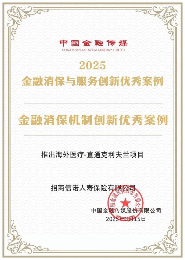 深圳 2025年5月14日 /美通社/ -- 近日,中國(guó)金融傳媒成功舉辦"保障金融權(quán)益 助力美好生活"2025金融消保與服務(wù)創(chuàng)新主題直播活動(dòng)。此次直播活動(dòng)上發(fā)布了2025金融消保與服務(wù)創(chuàng)新優(yōu)秀案例名單。招商信諾人壽保險(xiǎn)有限公司(以下簡(jiǎn)稱"招商信諾")憑借其"海外醫(yī)療-直通克利夫蘭"項(xiàng)目,獲評(píng)"2025年度金融消費(fèi)者權(quán)益保護(hù)與服務(wù)創(chuàng)新優(yōu)秀案例"。
