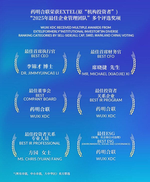上海 2025年5月20日 /美通社/ -- 全球領(lǐng)先的生物偶聯(lián)藥物合同研究、開(kāi)發(fā)和生產(chǎn)企業(yè)(CRDMO)藥明合聯(lián)(WuXi XDC,2268.HK)今日宣布,公司在國(guó)際權(quán)威金融評(píng)選機(jī)構(gòu)Extel(原《機(jī)構(gòu)投資者》)"2025年度亞洲地區(qū)公司最佳管理團(tuán)隊(duì)(不含日本)"榜單中的六大投票類(lèi)別均位居前列,包括:"最佳首席執(zhí)行官"、"最佳首席財(cái)務(wù)官"、"最佳董事會(huì)"、"最佳投資者關(guān)系企業(yè)" 、"最佳投資者關(guān)系專(zhuān)業(yè)人員"、 "最佳ESG(環(huán)境、社會(huì)和公司治理)"。