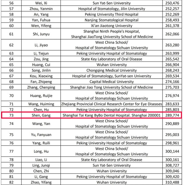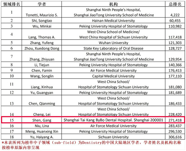 (*本表所列為榜單中子領域(sub-field)為Dentistry的部分中國大大陸地區(qū)學者,學者姓名及機構名稱榜榜單原版內容呈現(xiàn))