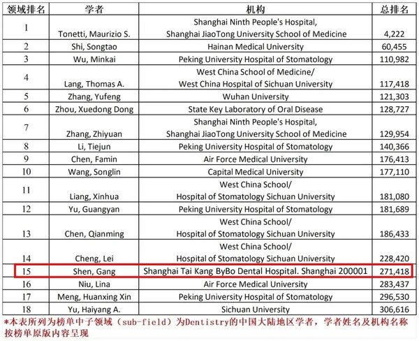 上海2025年9月23日 /美通社/ -- 近日,美國(guó)斯坦福大學(xué)基于Elsevier Scopus數(shù)據(jù)發(fā)布了2025《全球前2%頂尖科學(xué)家榜單》(World's Top 2% Scientists)。泰康口腔首席正畸專家、正雅GS技術(shù)與產(chǎn)系研發(fā)首席科學(xué)家沈剛教授連續(xù)三年入選該榜單,并同時(shí)榮登"終身科學(xué)影響力榜單",充分體現(xiàn)了其在口腔正畸學(xué)領(lǐng)域的國(guó)際學(xué)術(shù)影響力與持續(xù)創(chuàng)新的科研實(shí)力。